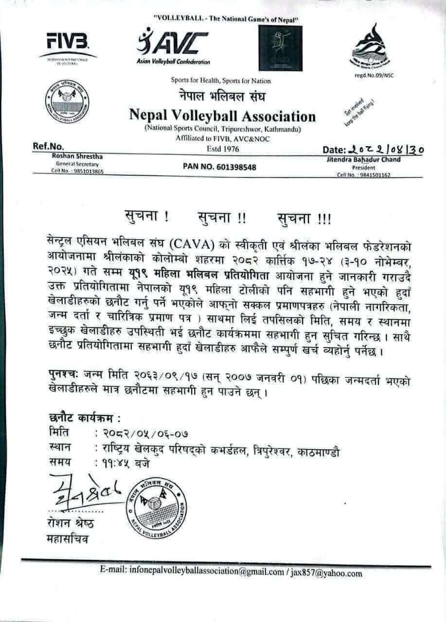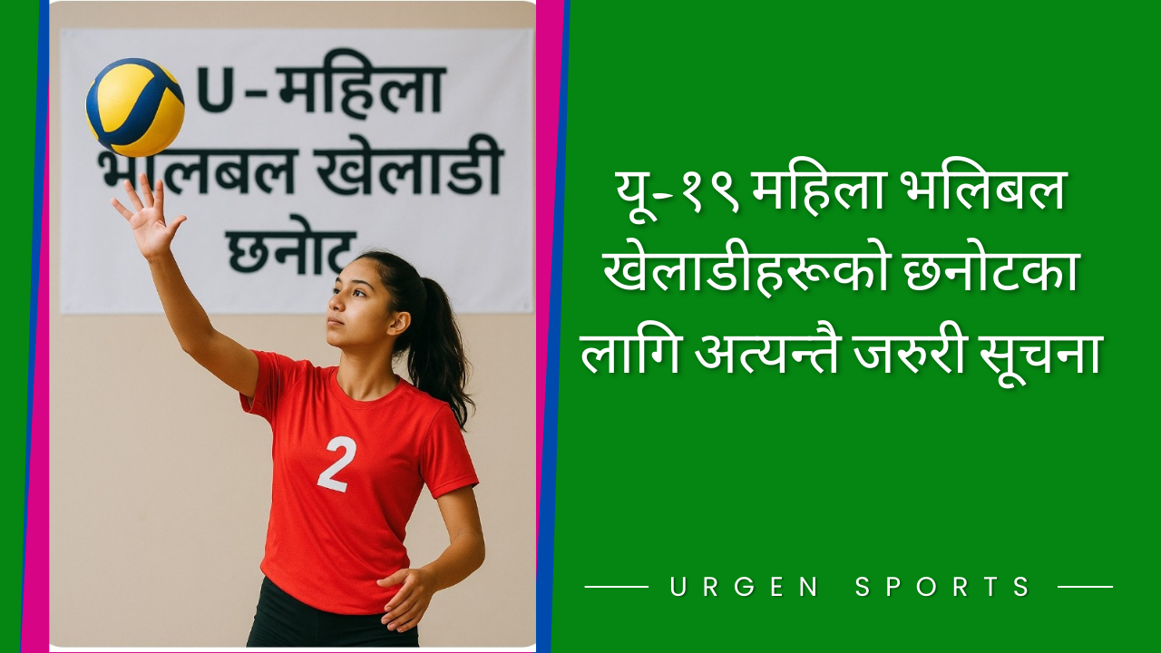 नेपाल भलिबल संघले यू–१९ महिला भलिबल खेलाडीहरूको छनोटका लागि अत्यन्तै जरुरी सूचना प्रकाशित गरेको छ। संघका अनुसार अन्तर्राष्ट्रिय तथा राष्ट्रिय प्रतियोगितामा प्रतिनिधित्व गर्ने उद्देश्यले योग्य र इच्छुक खेलाडीहरूलाई निर्धारित मिति, समय र स्थानमा उपस्थित हुन आग्रह गरिएको छ।