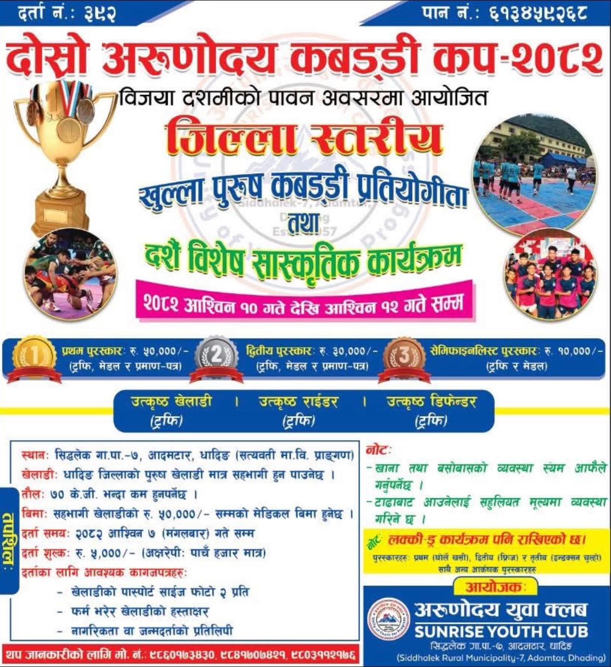 कार्यक्रममा दशैँ विशेष सांस्कृतिक प्रस्तुति पनि रहनेछ। प्रतियोगितामा सहभागी हुन प्रत्येक टिमले पाँच हजार रुपैयाँ प्रवेश शुल्क अर्थात टिम दर्ता शुल्क तिर्नुपर्नेछ। टिम दर्ता समय आश्विन ७ गते सम्म रहेको छ । खेलाडीले आफ्नो परिचयपत्र, नागरिकता वा जन्म प्रमाणपत्र अनिवार्य रूपमा बुझाउनुपर्ने आयोजक अरुणोदय युवा क्लबले जनाएको छ।