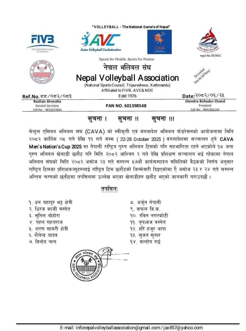 नेपाल भलिबल संघले बंगलादेशमा हुने CAVA Men’s Nation’s Cup 2025 का लागि प्रारम्भिक टोली घोषणा गरेको छ।