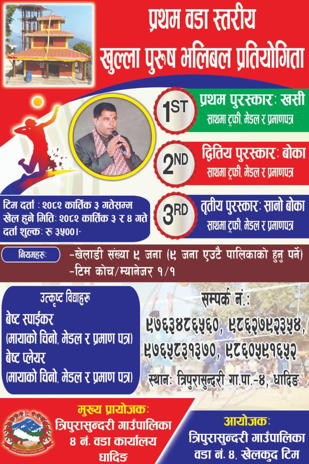 त्रिपुरासुन्दरी गाउँपालिका–४ धादिङमा पहिलो वडा स्तरीय खुल्ला पुरुष भलिबल प्रतियोगिता हुने भएको छ ।